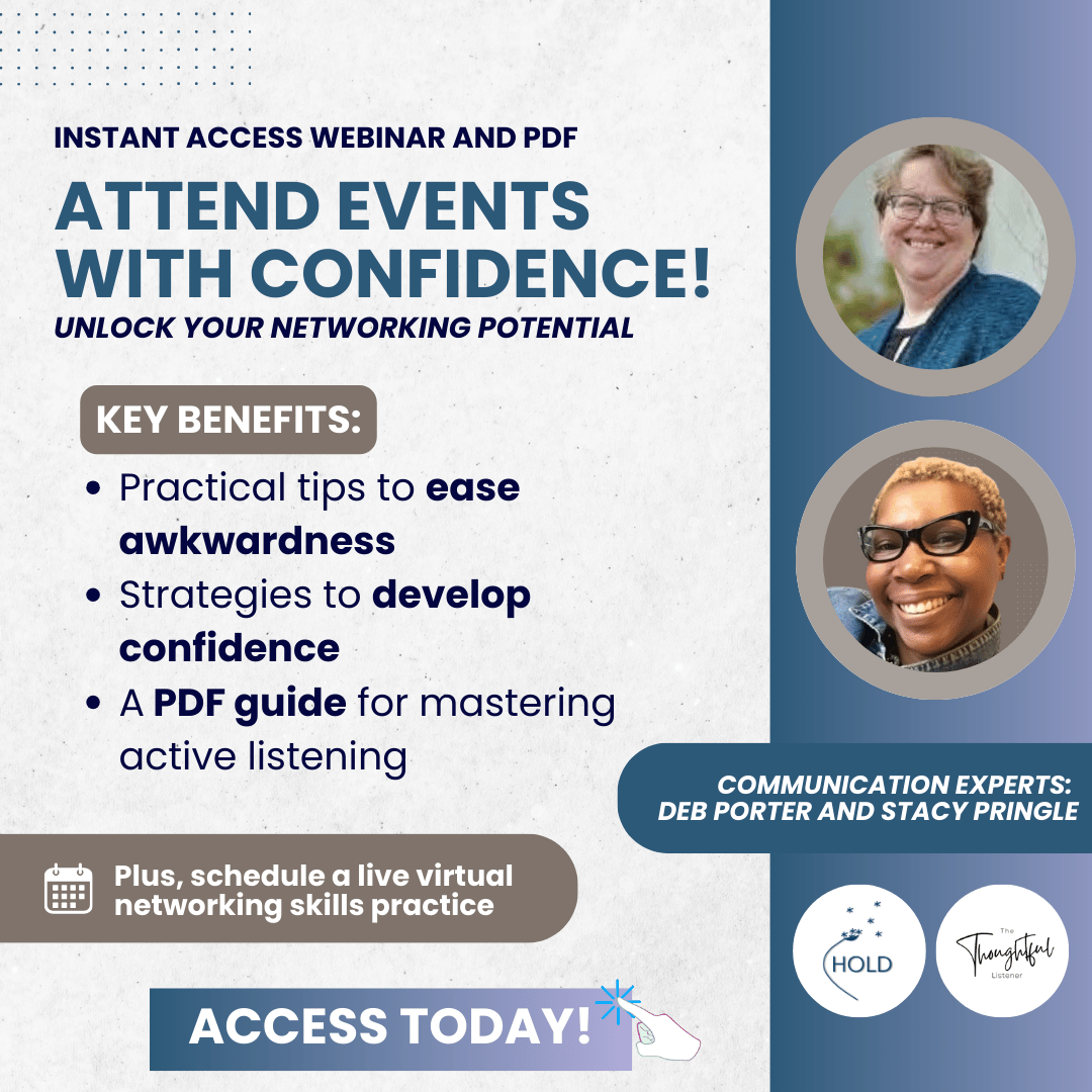 Thank you to Deb Porter of Hearing Out Life Drama for our collaboration, the attendees, and those who registered for No More Hiding: Network Confidently. My hope is our active listening tips improved your networking skills, and you are able to show up authentically and confidently at your next event.